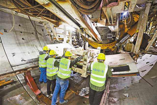 ▲重庆城轨快线15号线一期绣湖路车站,中国中铁的技术工人正在TBM掘进机内进行管片拼装。(摄于1月28日)
